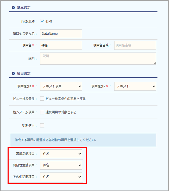 | 他システム項目 | 連携項目の対象とする場合は、チェックを入れます。 |