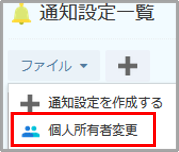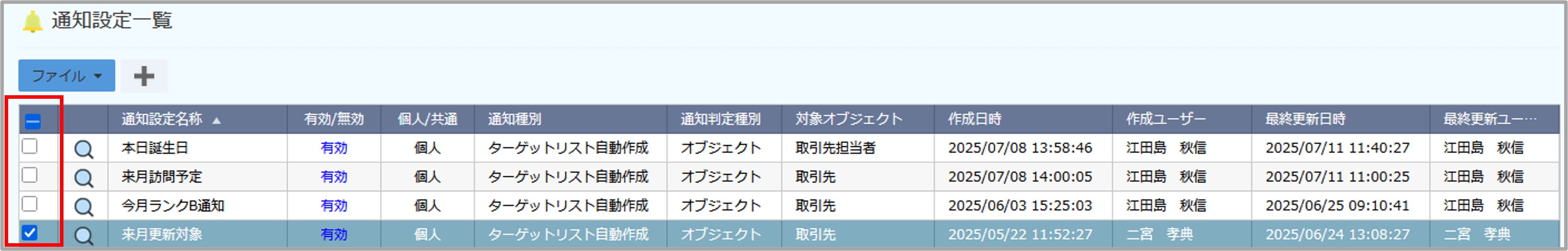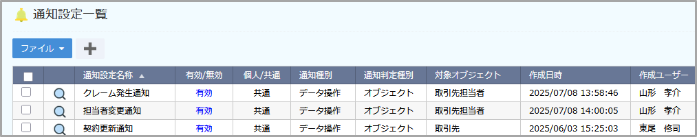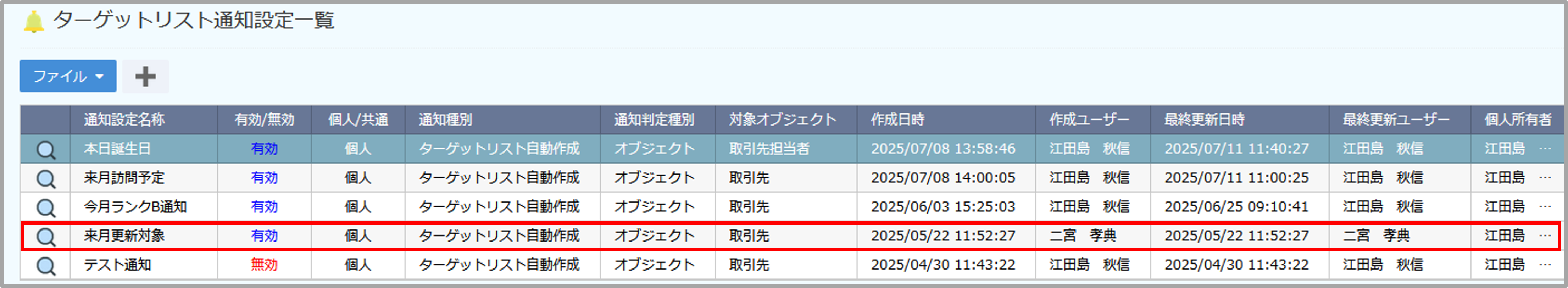 ターゲットリスト通知設定で作成された通知設定もこちらに表示されます。通知設定はそれぞれに個人所有者設定があり、ターゲットリスト通知設定ではユーザー所有の通知設定のみ表示されるようになっています。