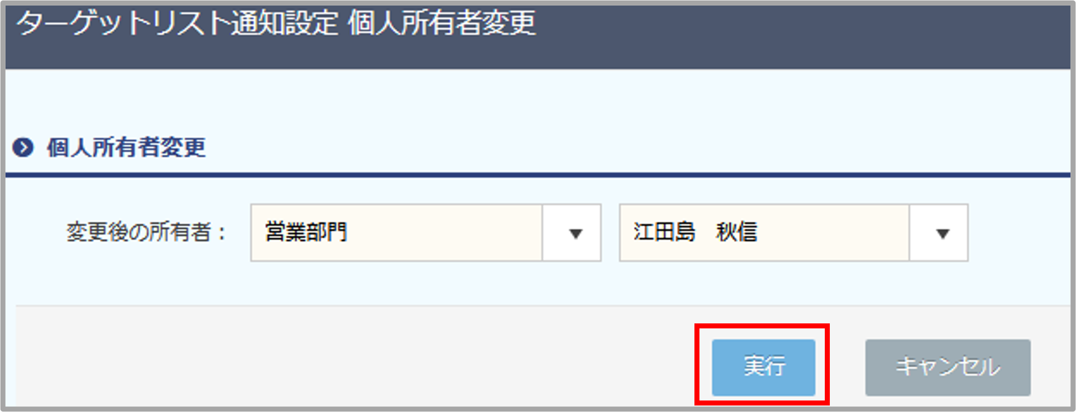 3. ダイアログが表示されるので変更したいユーザーを選択し[実行]をクリックすると完了ダイアログが表示される